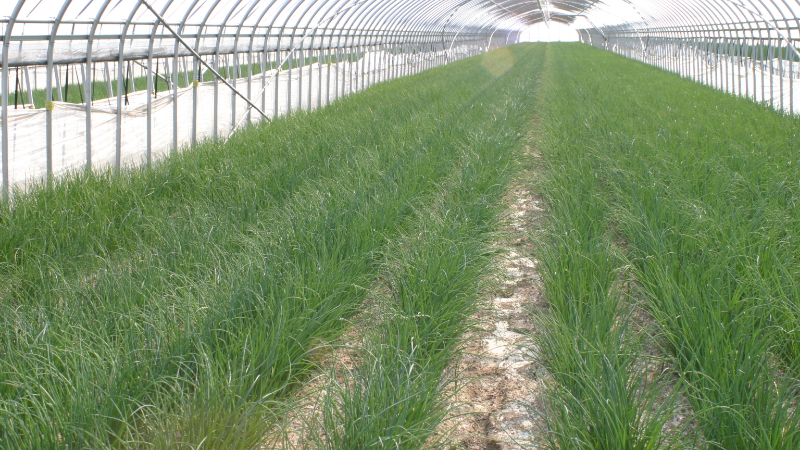 ここはビニールハウスの一部。ビニールハウスの資材も、環境に悪影響を及ぼす塩化ビニールからポリエチレン製に切り替えています。安心・安全な商品づくりのためのこだわりのひとつです。この中で、青ねぎがすくすくと育っています。
