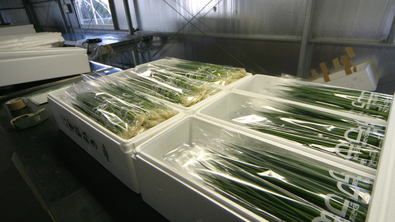 手作業で、1株、1株、丁寧に収穫します。当社は、約90%が注文生産ですから、計画して生産しています。このねぎたちも新鮮なまま出荷することができます。