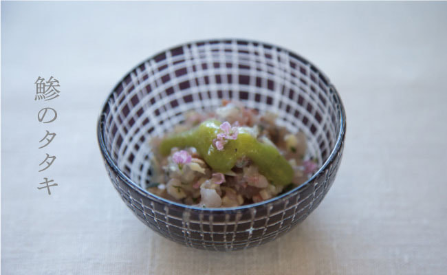 刻んだ生姜、茗荷、大葉を一緒に鯵を包丁でたたき、ネギドレをかけるだけ。